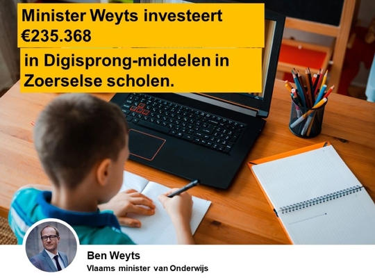 Vlaams minister van Onderwijs Ben Weyts (N-VA) investeert € 235.368 in Digisprong-middelen in Zoersel. “Dit is een ongeziene operatie. Scholen kunnen vanaf nu hun Digisprong voorwaarts nemen”, zegt Weyts. “We grijpen de coronacrisis aan om alle scholen mee te trekken in het digitale bad. Dat is een stevige stimulans voor meer onderwijskwaliteit.”